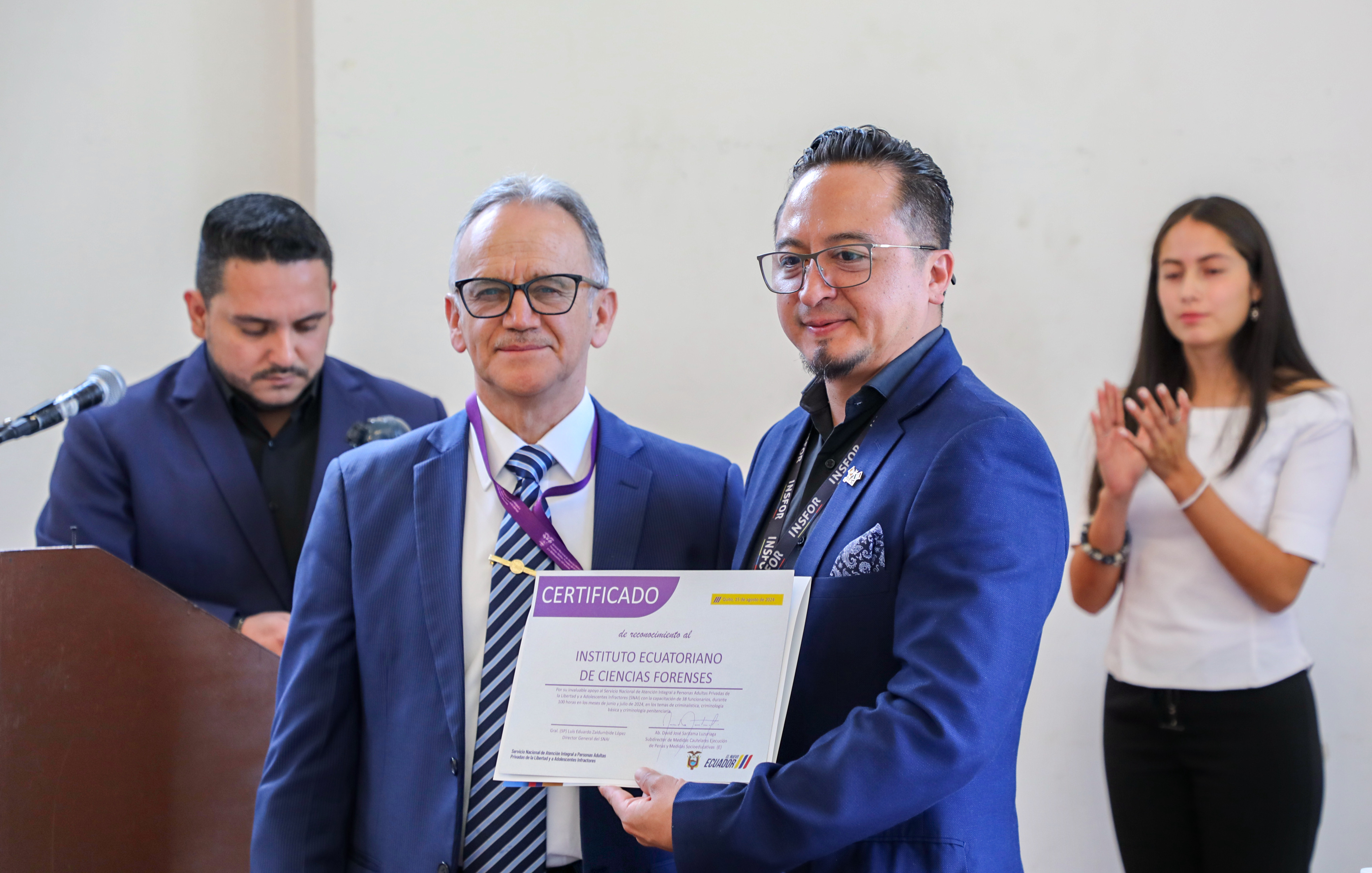 En la Casa de la Cultura Ecuatoriana (CCE), este jueves 15 de agosto de 2024, se realizó la clausura de las Capacitaciones en Criminalística, Criminología General y Forense, dictadas por el Instituto Ecuatoriano de Ciencias Forenses (INSFOR), que contó con la participación de 41 funcionarios y servidores de la Dirección de Penas No Privativas de Libertad, Dispositivos de Vigilancia Electrónica y Reinserción y de la Dirección de Inteligencia del SNAI. El acto contó con la presencia del Crnl. Fernando Carpio, subdirector general del SNAI, y demás autoridades.